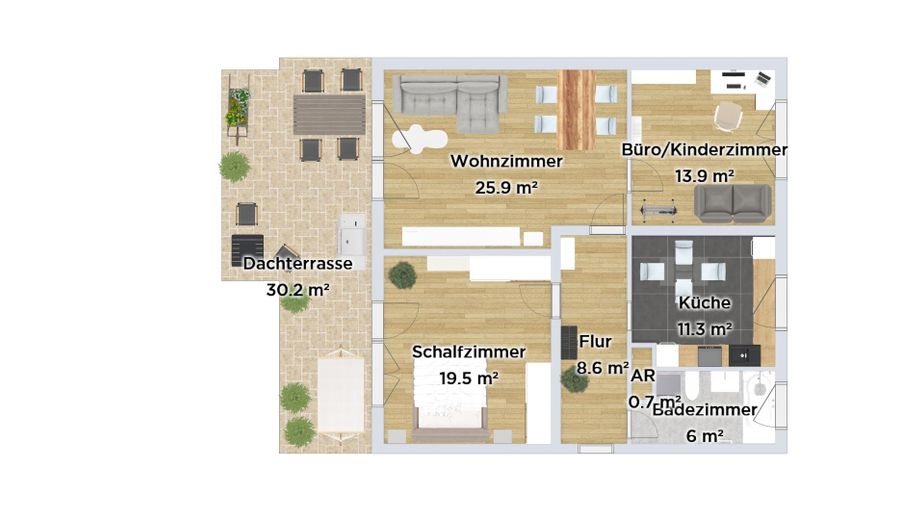 - offener und lichtdurchfluteter Wohnbereich mit Zugang zur Terrasse