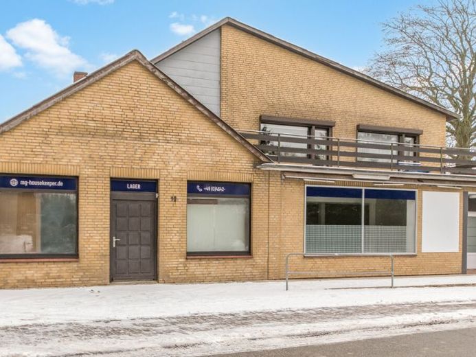 Die Erdgeschoss-Wohnung (ca. 56 m²) verfügt über drei Zimmer plus Küche und Badezimmer. Sie kann als Einliegerwohnung mit separatem Eingang vermietet werden, momentan wohnt dort ein Familienangehöriger. Zum Zeitpunkt der Übergabe des Hauses, werden beide Wohnungen zur Verfügung stehen. Die große Gewerbefläche umfasst ca. 126 m² zzgl. ca. 40 m² Lagerraum und befindet sich aktuell im Leerstand.