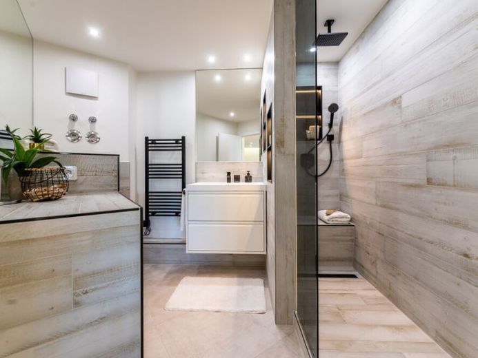 Das Badezimmer mit "Walk in" Dusche und Duschbank besticht durch sein elegantes Design in hellem Holz und Schwarzen Designelementen, seine hochwertige Ausstattung mit Waschtisch, matt-schwarzen Armaturen und einem Beleuchtungskonzept.