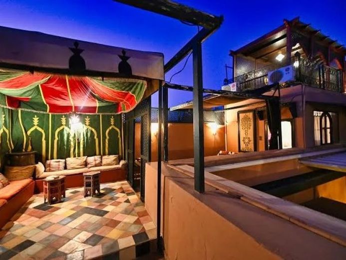 Wer dieses Riad zum ersten Mal betritt, ist wie verzaubert, wenn er nach wenigen Schritten im Zentrum des Gebäudes ankommt: ein oasengleicher Hof mit Orangenbäumen, um den herum sich die 9 Wohnräume gruppieren. Der Innenhof ist ein Ort der Stille, inmitten einer Altstadt voll pulsierendem Leben. Ein Duft von Minze und typisch marokkanischen Gewürzen dringt aus der Küche im Patio herüber. Kleine romantische Essecken oder ein landestypischer, großzügiger Esstisch mit Blick in den Sternenhimmel laden zum Verweilen ein. Eine Überdachung aus hochwertigem Stoff sorgt dafür, das Sie diesen Platz jederzeit genießen können. Der erste Eindruck sind die typisch kräftigen Farben Marokkos. Die Zimmer im Patio haben eine besondere Ausstattung mit Schlafzimmer, Dusche, separatem Badezimmer und Leseecke. Die Inneneinrichtung zeigt deutlich die Liebe zum Detail und dem berühmten Kunsthandwerk. Die farbenfroh gestalteten Zimmer haben den speziellen Tadelaktputz, ein Naturprodukt das für einen gesunden und ruhigen Schlaf sorgt. Wenn es doch abends kühl wird, sorgt eine Heizung für wohlige Wärme. Im I. Obergeschoß erwartet Sie eine Mini-Suite mit eigener Terrasse. Außerdem ein Appartement, hervorragend für frisch Verliebte. Von der Dachterrasse haben Sie einen fantastischen Blick in die Medina/Altstadt bis zum Hohen Atlas. Der Sonnenuntergang ist hier einmalig. Dieser Riad ist nicht mit Worten zu beschreiben. Ruhe genießen, Sonnenbaden; lassen Sie sich einfach von den exotischen Düften und Eindrücken verzaubern.