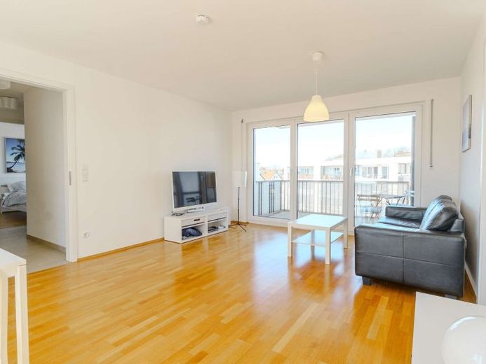 Große Fensterfronten sorgen für optimale Tageslichtnutzung und schaffen eine harmonische Atmosphäre, die den Blick auf die grüne Umgebung freigibt. Raumhohe Türen führen auf die ca. 5m² große, sonnige und umlaufende Südwest-Terrasse, die zu den Highlights dieser Wohnung gehört und den Wohnraum erheblich nach draußen erweitert.