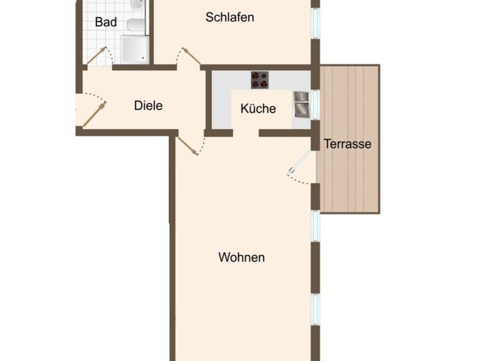 Auf ca. 66 m² Wohnfläche verteilt sich ein freundliches Wohnzimmer mit Zugang zur sonnigen Terrasse und dem liebevoll angelegten Garten, eine separate Küche, ein gemütliches Schlafzimmer sowie ein Badezimmer mit Badewanne und Dusche.
