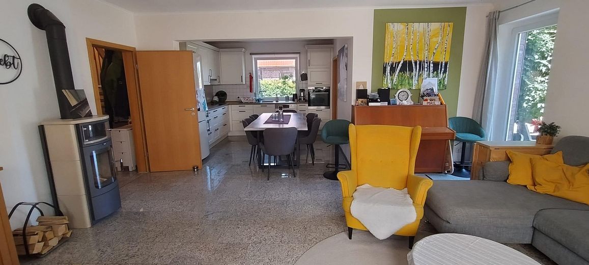 Hinter dem großzügigen Eingangsbereich im Erdgeschoss befindet sich ein lichtdurchflutetes Wohnzimmer mit Zugängen auf 2 Terrassen. Die Südterrasse verfügt über eine Aluminium-Vollglas-Überdachung (2022). Das Wohnzimmer ist mit einem modernen Kaminofen ausgestattet. Fließend geht der Wohnbereich in eine offene Küche mit neuwertiger Landhausküche (2021) über. Hier kann man gemütliche Stunden verbringen.