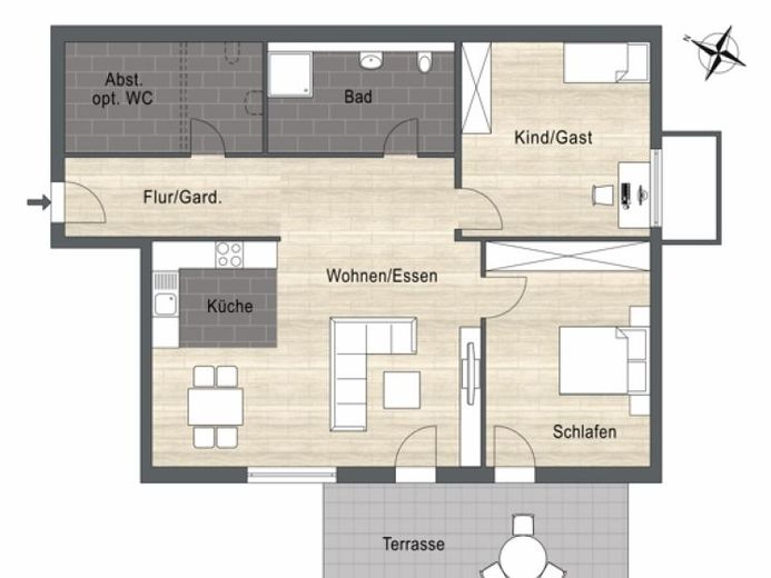 Im Badezimmer sorgt eine bodenebene Dusche für Bequemlichkeit. Die Waschmaschine und der Trockener haben hier auch einen Platz, so dass für Sie alles einfach zu handhaben ist. Aktuell können Sie optional noch zwischen einem Abstellraum oder einem separaten WC wählen.