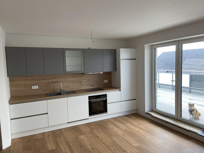 Im Wohn-/Essbereich wurde eine hochwertige Einbauküche mit Markenelektrogeräten (Herd, Backofen, Kühlschrank, Geschirrspüler) eingebaut. Die moderne Einbauküche mit weiß/seidengrauen Fronten in matt und einer Arbeitsplatte farblich passend zum Designfußboden in Holzoptik (Farbe Eiche hell San Remo) rundet das Wohnambiente ab.