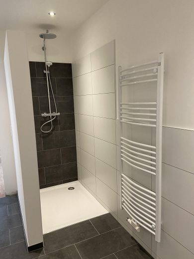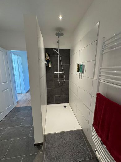 Das Duschbad wurde weiß und anthrazitfarben gefliest und begeistert durch einen Keramik-Waschtisch und einer bodenebenen großzügigen Duschtasse, 90 x 120 cm, mit Raindusche.