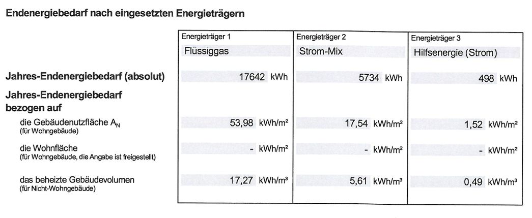 Als Basis für die Energieangaben wurde vom Eigentümer und dessen Architekten mitgeteilt, dass die Ausbaustufen der Büroanteile "wohnbereichsähnlich" ist und somit der wohnbereichsähnliche Anteil mehr als 50% beträgt. Entsprechend ergeben sich die Angaben zur Energie wie folgt:
