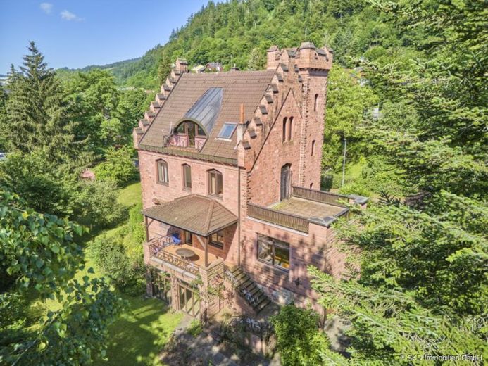 Das Anwesen erhebt sich majestätisch in der historischen Staufer-Stadt Eberbach und ist ein wahrer Blickfang mit seinem markanten Türmchen und der charakteristischen Tudor-Architektur, die an die prächtigen Schlösser vergangener Zeiten erinnert.