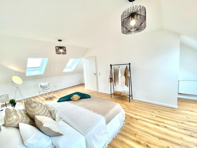 Im Erdgeschoss erwartet Sie ein offener Wohn- und Essbereich mit angrenzender Küche – hell, einladend und kommunikativ. Außerdem gibt es ein Gästebad sowie ein weiteres Zimmer, das sich ideal als Büro oder Kinderzimmer eignet. Vom Wohnzimmer aus gelangen Sie direkt in den schönen Garten mit rund 600 m² Grundstücksfläche.