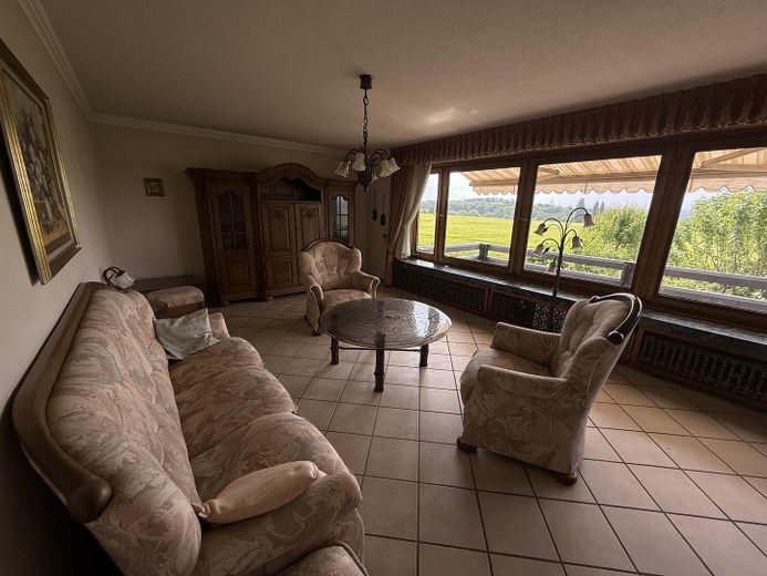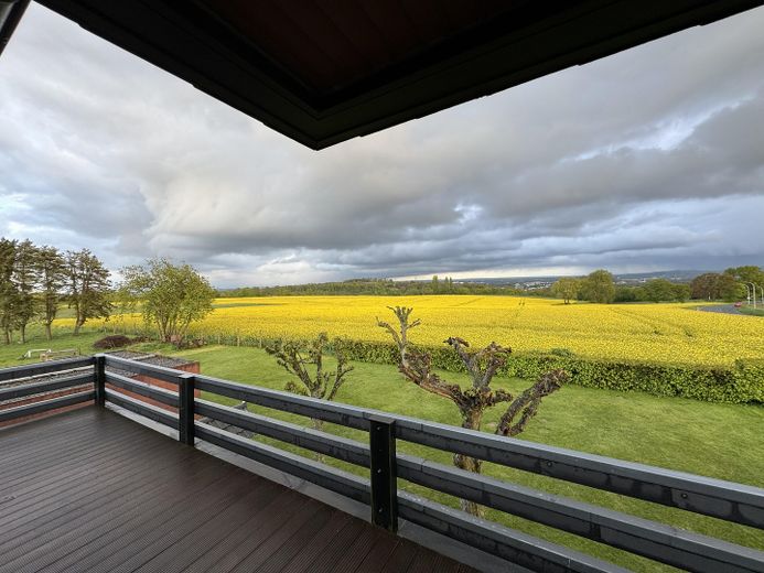 Die erste Etage bildet den zentralen Wohnbereich des Hauses. Hier stehen ein sehr großes, lichtdurchflutetes Wohnzimmer mit optimaler Ausrichtung, eine Küche, ein Esszimmer ( alternativ 3. Schlafzimmer ) sowie ein Badezimmer zur Verfügung. Ein außergewöhnlich großer Balkon mit Markise und freier Sicht in Richtung Aachen erweitert den Wohnraum nach außen.