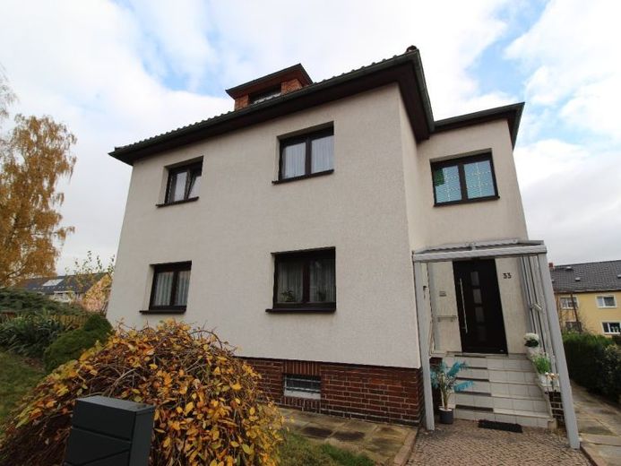 Dieses Objekt wurde ca. 1936 als großzügiges Einfamilienhaus mit zwei Wohnetagen in massiver Bauweise errichtet und ist über die Jahre instandgehalten worden. Das Wohnhaus mit zwei Vollgeschossen betritt man über den Windfang und gelangt in die erste Diele mit Treppe und Zugang zu den Wohnräumen im Erdgeschoss. Dort befinden sich derzeit drei Wohnräume, davon einer als Durchgangszimmer und das ältere Bad mit Wanne und WC. Im Obergeschoss befindet sich zur Zeit die Küche, ein großes Wohnzimmer sowie der geschlossene Balkon. Das Dachgeschoss ist ausgebaut und isoliert, die Heizungsinstallation für den Raum ist vorbereitet und könnte danach ein weiterer Wohnraum werden.