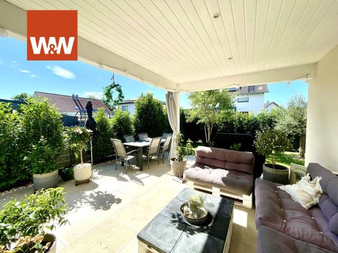 Genießen Sie entspannte Stunden auf der überdachten Terrasse, die einen herrlichen Blick in den gepflegten Garten bietet.