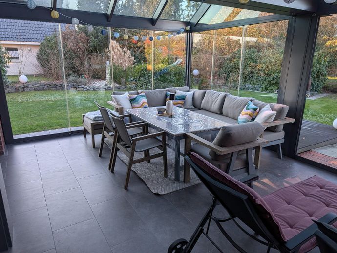 - Offener Wohn- und Essbereich mit bodentiefen Fenstern und direktem Zugang zum Garten