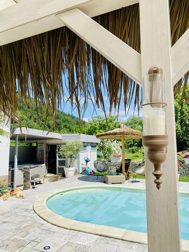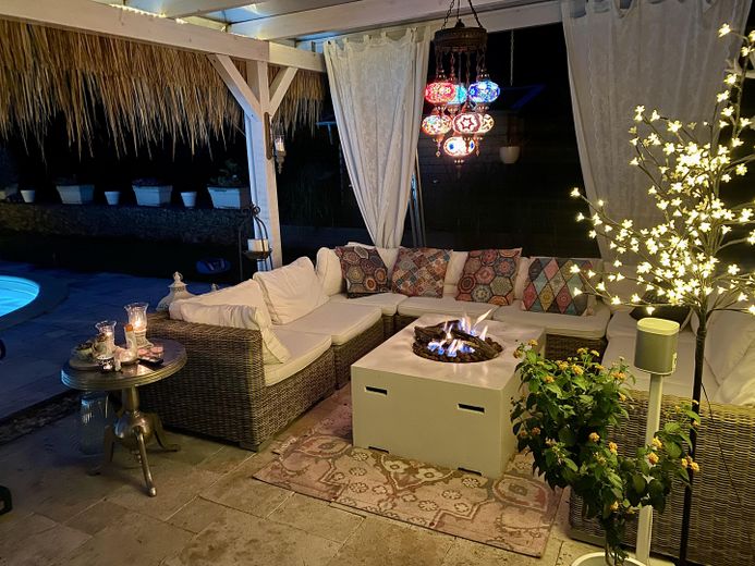 Der lichtdurchflutete Wohn- und Essbereich öffnet sich zur rund 40 m² großen, überdachten Terrasse – ideal zum Entspannen, Feiern und Genießen. Im gepflegten Garten warten Pool, Jacuzzi und eine voll ausgestattete Außenküche – perfekt für laue Sommerabende.