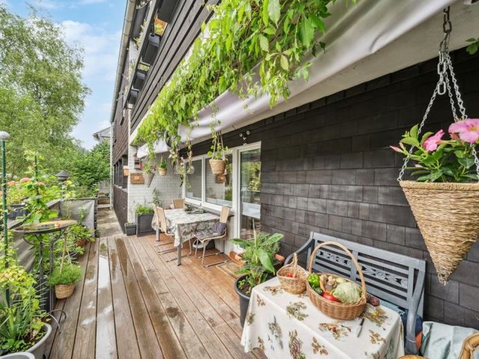 Das Wohnzimmer, sowie der Koch-/Essbereich schließen direkt an die über 40 m² große Terrasse an und laden zum Grillen und Verweilen in der Natur ein. Von hier aus haben Sie auch direkten Zugang in Ihren Garten, welcher nur von dieser Einheit genutzt und betreten werden kann. Hier haben Sie Ihre völlige Ruhe, da dieser Bereich keine Einsicht von außen bietet.