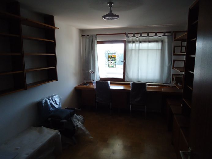 Attraktive Etagenwohnung mit großem abgeschlossenem Balkon und Wohnzimmer mit breiter Fensterfront mit Beeten davor. Einbauschränke und Couchformation mit Möglichkeit Projektion (Projektor nicht inbegriffen) an die weiße Wand, Großzügiges Schlafzimmer mit Einbauschränken, Bett, Nachttischen, zwei optional als Schlafzimmer oder Arbeitszimmer zu nutzende Zimmer mit Einbauschränken und Sitz-,Schlafmöglichkeiten und Tischen (Schlafmöglichkeit, Internetanschluss), Badezimmer mit Doppelwaschbecken, Badewanne, Duschabteil, Waschmaschine, Schränke; Flur mit Garderobe, separates WC, Esszimmer mit Tisch und Stühlen, Schrank; Einbauküche mit Herd, Einbauschränken, Geschirrspülmaschine, (Backmikrowelle möglich) , Nordbalkon, Abstellkammern auf Balkon und am Flur-Ende.