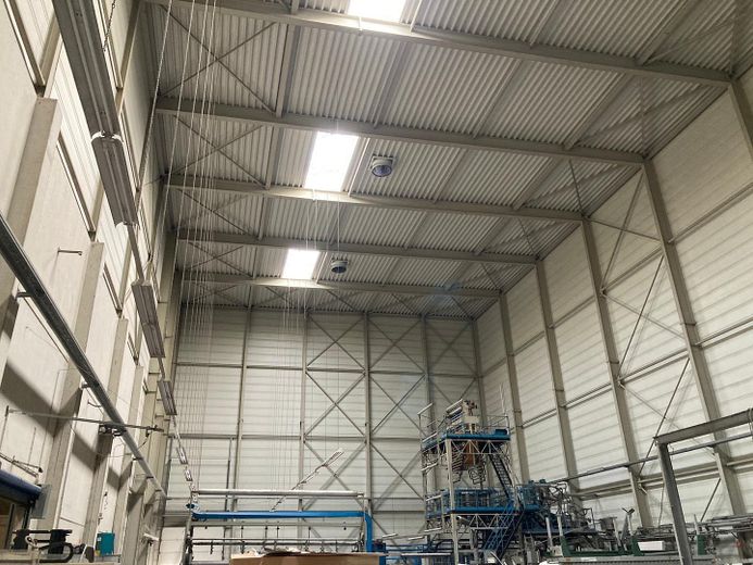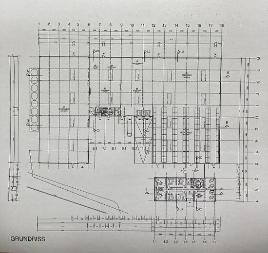 Auf dem komplett befestigten Grundstück befindet sich eine Halle mit ca. 1350 qm Grundfläche und einer Höhe von 20 m. Es gibt hier ein 4 x 4 m großes ebenerdiges Tor. Die restlichen ca. 2825 qm Hallenfläche mit Sozialeinrichtungen sind 8 m hoch. Es gibt hier 2 Laderampen und ein 4 x 4 m großes ebenerdiges Tor.