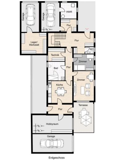 Von der großen vorderen Garage kommt man trockenen Fußes in den Hauptflur, dazwischen sogar noch eine Speisekammer.