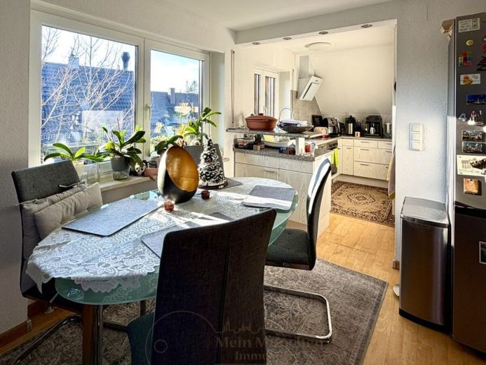 Wohnen, Essen und Kochen sind in einem lichterfüllten Raum untergebracht, der gehobenen Wohnansprüchen gerecht wird. Die Küchenzeile ist mit einem Cerankochfeld, Dunstabzug, Backofen, Kühl-Gefrier-Kombination und Geschirrspüler ausgestattet. Besonders hervorzuheben ist der Süd-West-Balkon, der den Wohnbereich in den Sommermonaten angenehm nach draußen erweitert.
