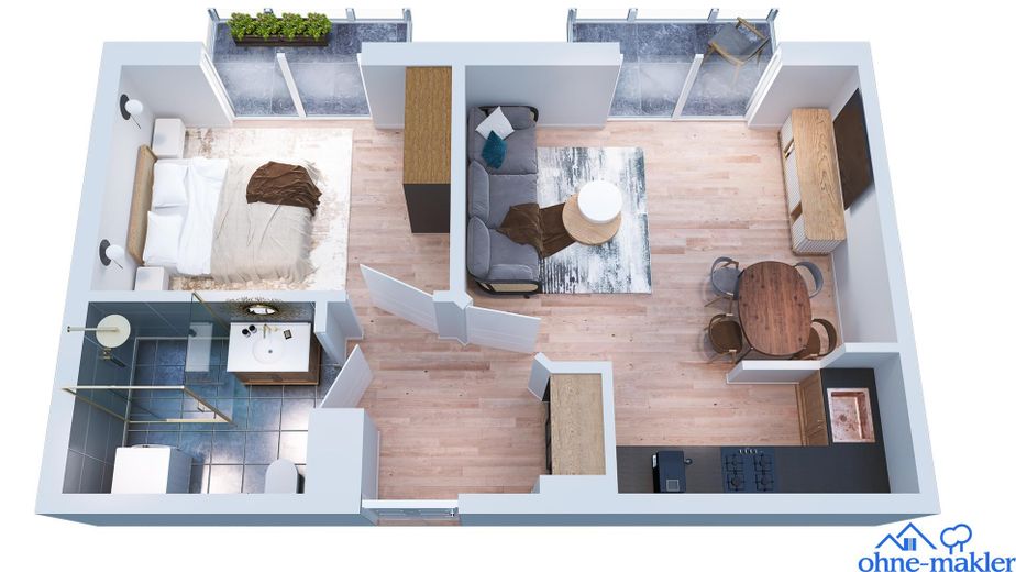Die Wohnung ist altersgerecht mit großen Eingangs- und Innentüren ausgestattet. Über den gut geschnittenen Flur mit einem tollen Einbauschrank betritt man das Schlafzimmer, das riesige Bad oder das Wohnzimmer mit angrenzender Einbauküche. Die Terrasse ist ein Highlight der Wohnung: Sie ist über die gesamte Rückseite der Wohnung gebaut und sowohl vom Schlafzimmer als auch vom Wohnzimmer aus zu betreten.