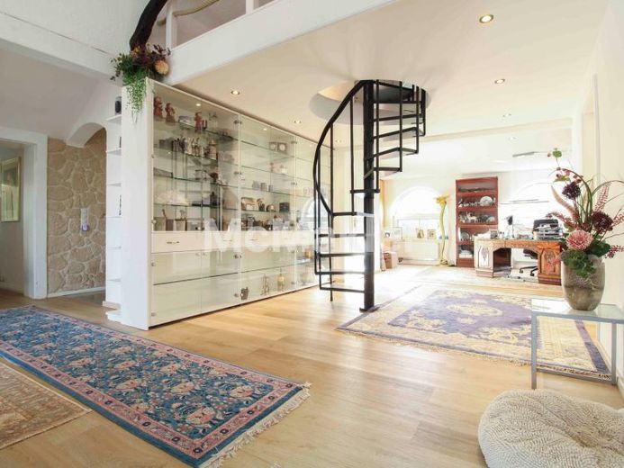 Auf rund zweihundert Quadratmetern Wohnfläche verteilt auf sieben Zimmer bietet die Immobilie ausreichend Platz für große Familien oder Menschen, die Wohnen, Arbeiten und Hobby unter einem Dach vereinen möchten. Der außergewöhnliche Grundriss verbindet offene Bereiche mit Rückzugsorten und schafft damit ein Zuhause voller Möglichkeiten. Das Herzstück bildet das offene Wohnzimmer mit Galerie und Kamin. Die lichte Höhe, der Blick in den oberen Bereich und das warme Flammenspiel des Kamins verleihen dem Raum eine Atmosphäre, die sofort Geborgenheit ausstrahlt. Hier entstehen Familienmomente, an die man sich auch nach vielen Jahren gern erinnert.