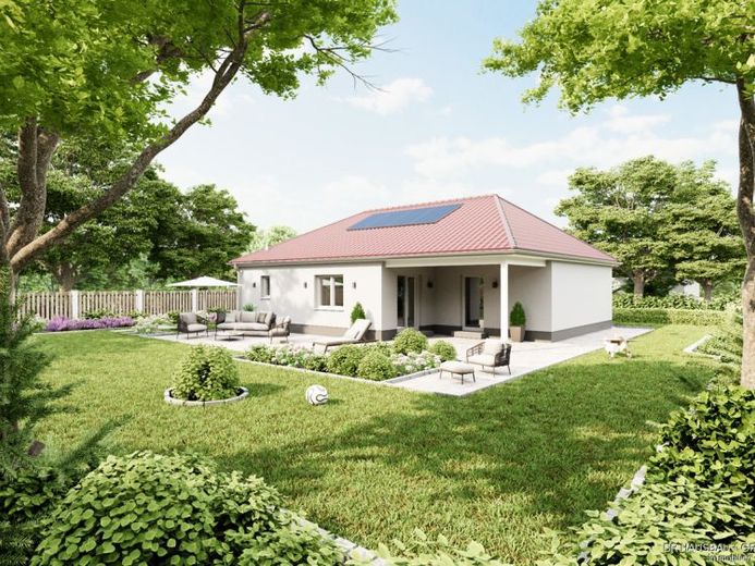 Hier ragt die überdachte Terrasse mit knapp 9 m², mit Zugang zum Kinderzimmer und Wohnbereich, beispiellos heraus und reißt damit jeden in seinen Bann. Der Unverbesserliche B960 wickelt mit seinen 124,60 m² Wohnfläche und 4 Schlafzimmern auf einer Ebene jeden um den Finger. Die Abbildung zeigt eine Ausstattungsvariante.
