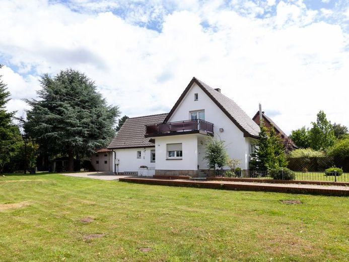 Das parkähnliche Grundstück mit altem Baumbestand reicht bis zum idyllischen Flusslauf der Düte – ein Ort, der zum Entschleunigen einlädt. Gleichzeitig eröffnet die Größe und Beschaffenheit des Areals außergewöhnliche Möglichkeiten: