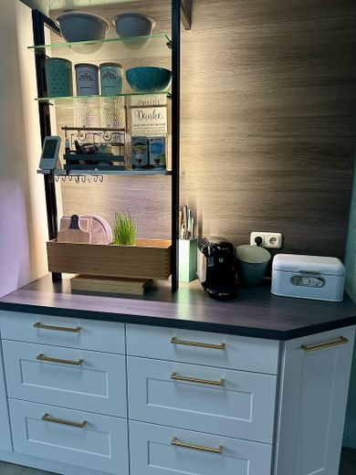 Der Neff-Slide-Backofen auf Arbeitshöhe, die Siemens-Spülmaschine inkl. timelight und die Samsung noFrost Kühl-/Gefrierkombination mit 2 seperaten FreshZonen unterstreichen die Hochwertigkeit. Gesamtwert der Küche ist über 16.000€.