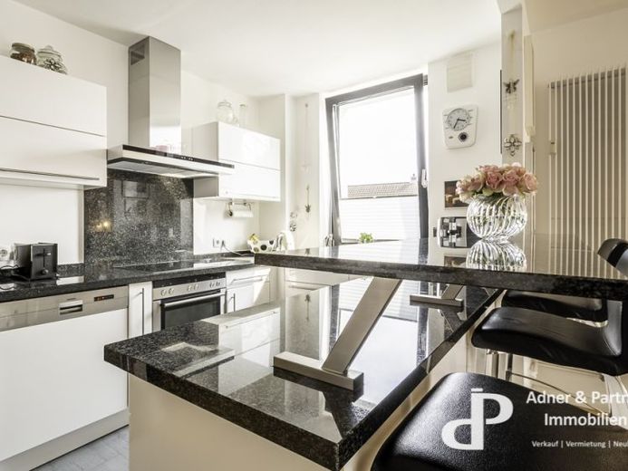 Der Wohnbereich ist offen gestaltet, mit einer eingebauten Nolte-Einbauküche samt Siemens-Elektrogeräten, Granitarbeitsflächen und Esstheke. Ein Arbeitsbereich für Homeoffice ist räumlich integriert.