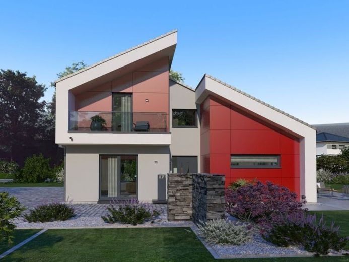 Bei unserem Musterhaus Simmern trifft eine außergewöhnliche Fassadengestaltung auf ein Wohnerlebnis der besonderen Art. Die Außengestaltung wird geprägt durch das versetzte Pultdach und den Rückversatz eines Bauteils, der durch zwei überdachte Balkone nicht nur optische, sondern auch echte wohnliche Mehrwerte mit sich bringt. Diese Mehrwerte setzen sich auch im Inneren fort. Attraktiver Mittelpunkt ist der mehr als 55 m² große Wohn-Ess-Koch-Bereich, der mit zahlreichen Fensterelementen und mit den hohen Decken punktet und dadurch noch größer wirkt. Auch der Rückzugsort der Eltern befindet sich Parterre: mit Schlafbereich, Ankleidezimmer, Badezimmer und separater Toilette. Büro und Gäste-WC runden das Raumangebot im Erdgeschoss ab. Oben: das Reich der Kinder. Highlights hier sind die beiden Balkone und die große Galerie. Musterhaus Simmern - mehr als Wohnen.