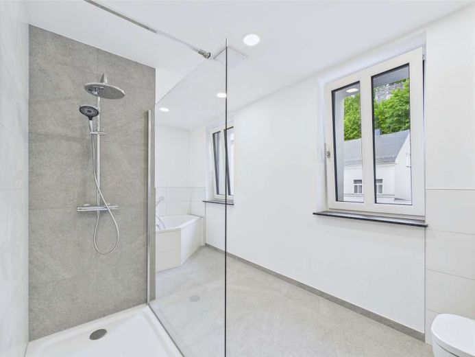 - Designbäder mit großformatigen Fliesen, Regendusche, Badewanne und Tageslicht