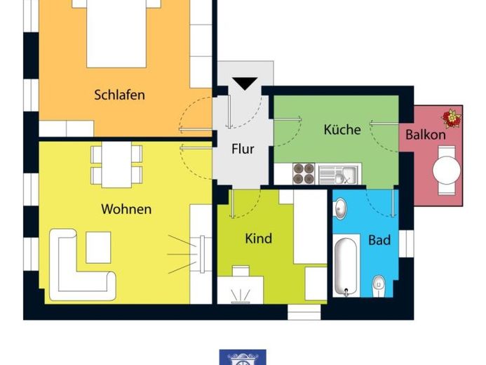 Alle Wohnräume sowie die separate Küche sind direkt vom Flur aus erreichbar und bieten eine klare, funktionale Raumaufteilung. Von der Küche aus gelangen Sie auf den Balkon, der zusätzlichen Freiraum im Alltag schafft. Das Tageslichtbad ist mit einer Badewanne ausgestattet und praktisch über die Küche zugänglich.