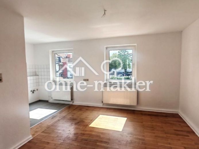 Das helle Wohnzimmer mit gepflegtem Holzboden bietet ausreichend Platz für eine gemütliche Sofaecke. Durch die großen Fenster fällt viel Tageslicht in den Raum, was eine angenehme Wohnatmosphäre schafft.