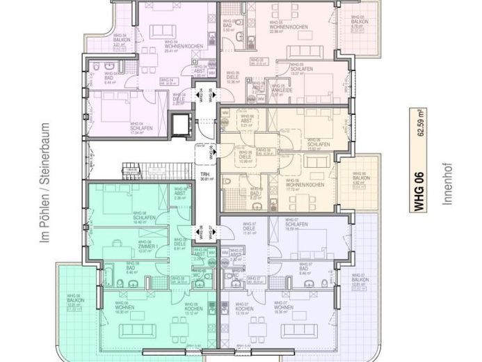 Die Wohnung besteht aus dem hellen Wohn/Essbereich von ca. 23 m² mit integrierter Küche. Vom hellen Wohnraum gelangen Sie auf den großzügigen Balkon von ca. 9 m². Von der zentralen Diele gelangen Sie in das schöne Duschbad mit großer Dusche, den Abstellraum sowie in das schöne Schlafzimmer mit Ankleide von ca. 16 m². Die gesamte Wohnfläche beträgt ca. 62 m².
