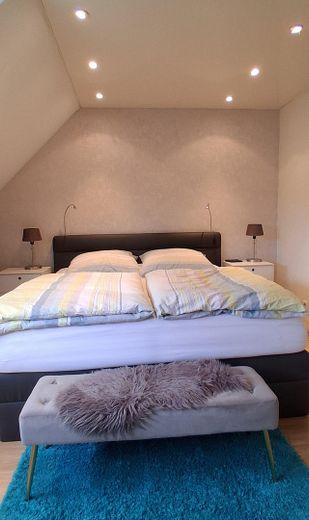 Die Treppe hinauf gelangt man in das obere Stockwerk. Ein großes Schlafzimmer mit Einbauschränken empfängt einen – viel Platz, viel Ruhe. Daneben das Arbeitszimmer, das ebenso gut ein Kinderzimmer sein könnte. Und wer noch mehr Raum braucht, findet Ausbaureserven, die nur darauf warten, genutzt zu werden.