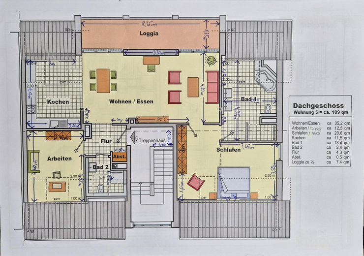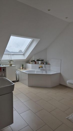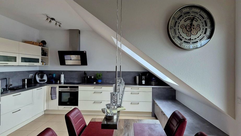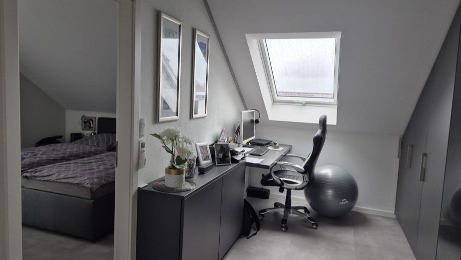 Zum Verkauf steht hier ein wunderschönes Penthouse ähnliches 109 m² großes lichtdurchflutetes Dachgeschoss. Wohnen auf einer Etage ohne direkten Nachbarn. Es handelt sich um eine 4 Zimmer Wohnung, großes Wohn-/Esszimmer mit Einbauküche, Schlafzimmer mit angrenzten Homeofficebereich und Ankleidezimmer, Kinder- oder Gästezimmer, modernes Dusch-/Wannenbad (Bad en Suite/Masterbad), Gäste - WC mit integrierter Duscheinheit. Die Wohnung verfügt über eine Loggia mit süd-west Ausrichtung, die sowohl vom Ess- als auch Wohnbereich begehbar ist. Die Wohnung hat 3-fach verglaste Kunststoff - Fenster. Die Velux - Dachfenster sind in den Wohn-/Schlafbereichen mit elektrischen Solar – Rollläden, ebenfalls von Velux, ausgestattet. Zusätzlich gibt es auch Verdunklungsrollos. Alle übrigen bodentiefen Fenster sind mit elektrischen Rollläden ausgestattet. Highlight dieses Dachgeschoßes ist neben der Fußbodenheizung die Klimatisierung (Daikin). Wohn-/Essbereich, Flur und Bäder sind gefliest. Die Schlafräume sind kürzlich mit Vinyl in Fliesen-Betonoptik ausgestattet worden. Ein zur Wohnung da-zugehörender PKW Stellplatz ist ebenfalls im Kaufpreis enthalten. Kein Wartungs-stau/Renovierungsbedarf. KfW-70 Standard Effizienzhaus – Lüftungsanlage mit Wärmerückgewinnung. Energieausweis liegt bei Kauf vor (A+). Keine Makleranfragen – Privatverkauf. Exposé / weitere Bilder auf Anfrage/nach Besichtigung.