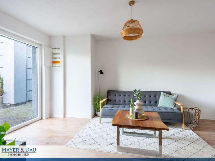 Der einladende Eingangsbereich dient zugleich als gemütliche Terrasse für einen Aufenthalt im Freien. Von einem zentralen Flur erreichen Sie linksseitig das helle Wohn- und Esszimmer, das moderne Badezimmer mit Tageslicht sowie gegenüberliegend das Schlafzimmer.