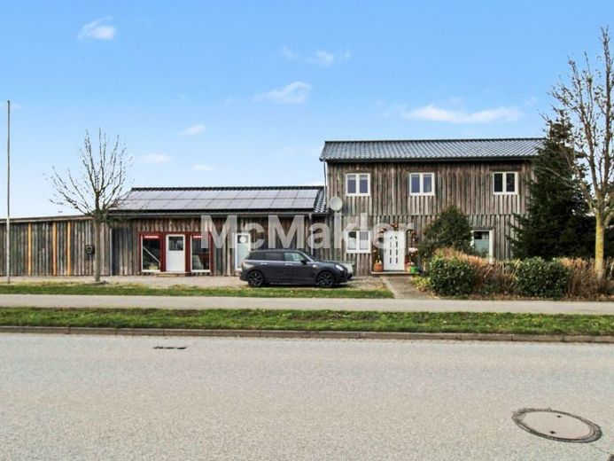 Diese außergewöhnliche Gewerbe- und Wohnimmobilie im Gewerbegebiet von Kappeln vereint harmonisch Wohnen und Arbeiten. Auf einem 1.124 Quadratmeter großen Grundstück erstreckt sich das in Holzständerbauweise und mit hochwertiger sibirischer Lärche verkleidete Wohnhaus über zwei Etagen und etwa 204 Quadratmeter. Es bietet insgesamt acht Zimmer, davon 6 Schlafzimmer sowie drei Bäder, darunter ein luxuriöses Bad en Suite mit Sauna im Untergeschoss mit eigener überdachter Terrasse.