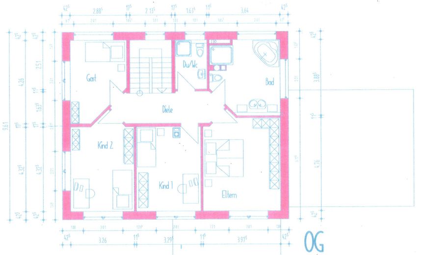 Im Obergeschoss befinden sich vier Schlafzimmer und zwei Bäder. Ein größeres Elternbad und ein Kinderbad. Mit dem kleinen Büroraum im Erdgeschoss, wären sogar vier eigene Kinderzimmer möglich.