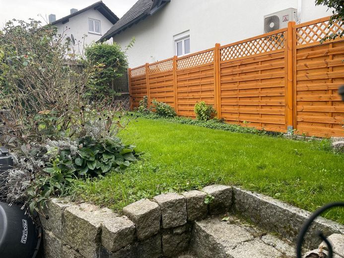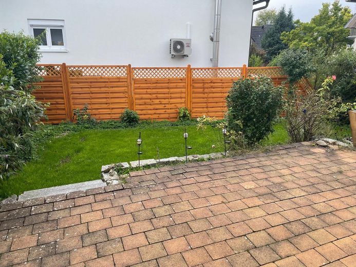 Der Außenbereich besticht durch einen Vorgarten, eine Terrasse mit großflächiger Markise und einen Garten. Eine Garage sowie ein Stellplatz runden das Angebot ab.