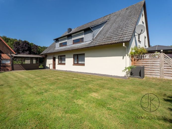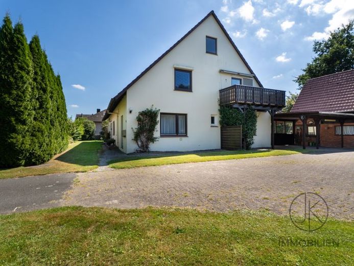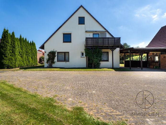 Als praktische Ergänzung gibt es ein Nebengebäude, das vielseitig genutzt werden kann. Ein Bereich dient als Geräteschuppen, der andere eignet sich hervorragend als Werkstatt oder kreativer Hobbyraum. Für Fahrzeuge steht ein Carport mit einem Stellplatz bereit, dazu weitere Parkmöglichkeiten für Gäste.