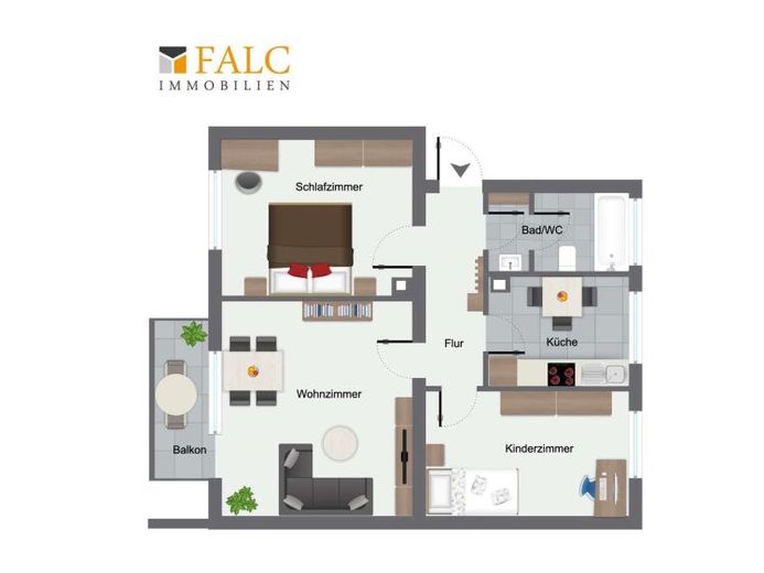 Auf der rechten Seite befindet sich am Flurende das geräumige Wohnzimmer. Große Fenster lassen viel Tageslicht herein und schaffen eine angenehme Atmosphäre. Von hier aus gelangen Sie auf den Balkon, der sich ideal für entspannte Stunden im Freien eignet.