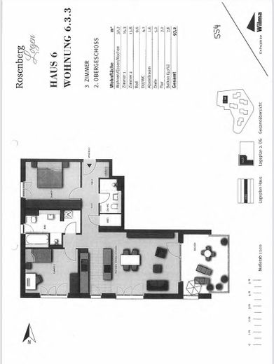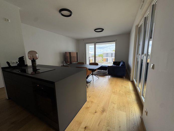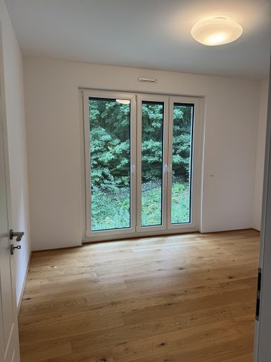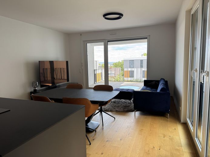 Die Wohnung verfügt über einen großzügigen Wohn- und Essbereich mit Zugang zur sonnigen Loggia, eine elegante Next125-Einbauküche mit hochwertigen Geräten, zwei Schlafzimmer, ein modernes Tageslichtbad mit Badewanne und Dusche sowie ein separates Gäste-WC.