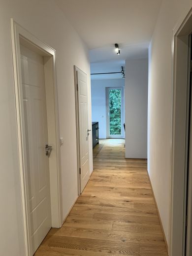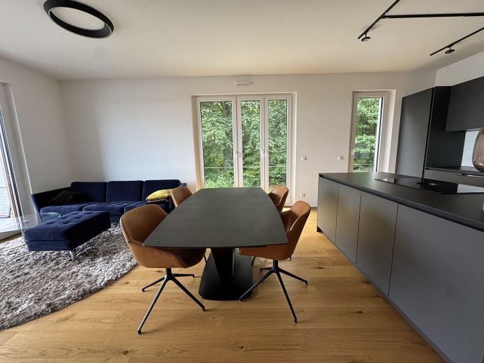 Echtholzparkett, Fußbodenheizung, Designleuchten (TIDAL, Light Empire, SQUBE) und bodentiefe Fenster verleihen der Wohnung ein helles und stilvolles Ambiente.