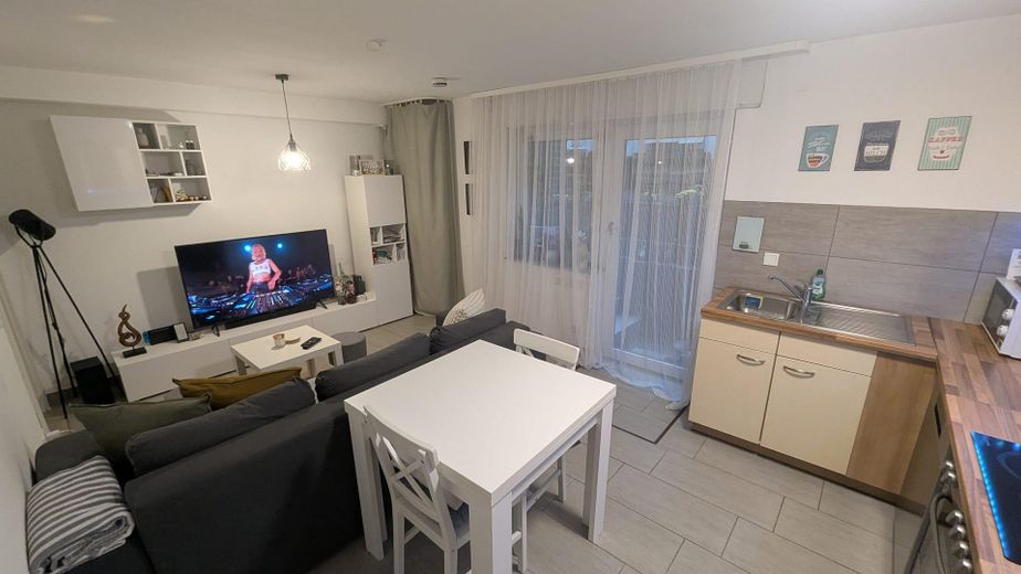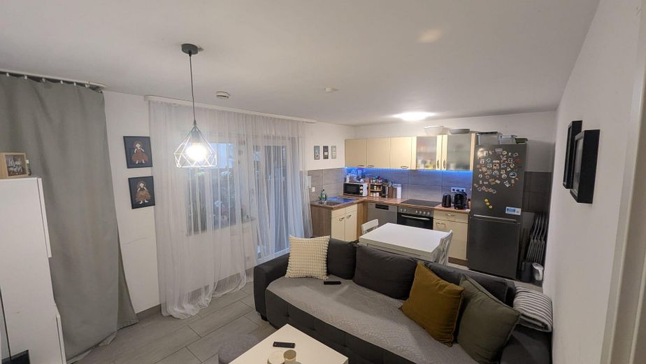 Man kommt direkt in den Wohn- Küchenbereich. Dieser ist schön hell, da ein großes Fenster und Glastür eingebaut wurden.