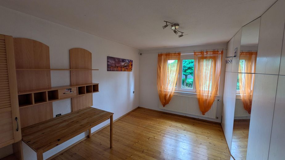 Im weitgehend ausgebauten Dachgeschoss befindet sich ein geräumiges Zimmer mit bodentiefem Fenster mit Aussicht über den Ort.