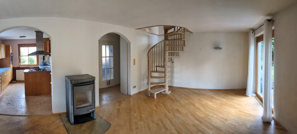 Neben dem Treppenhaus kann man auch über die Wendeltreppe im Wohnzimmer direkt in die Räume im OG und DG gelangen.