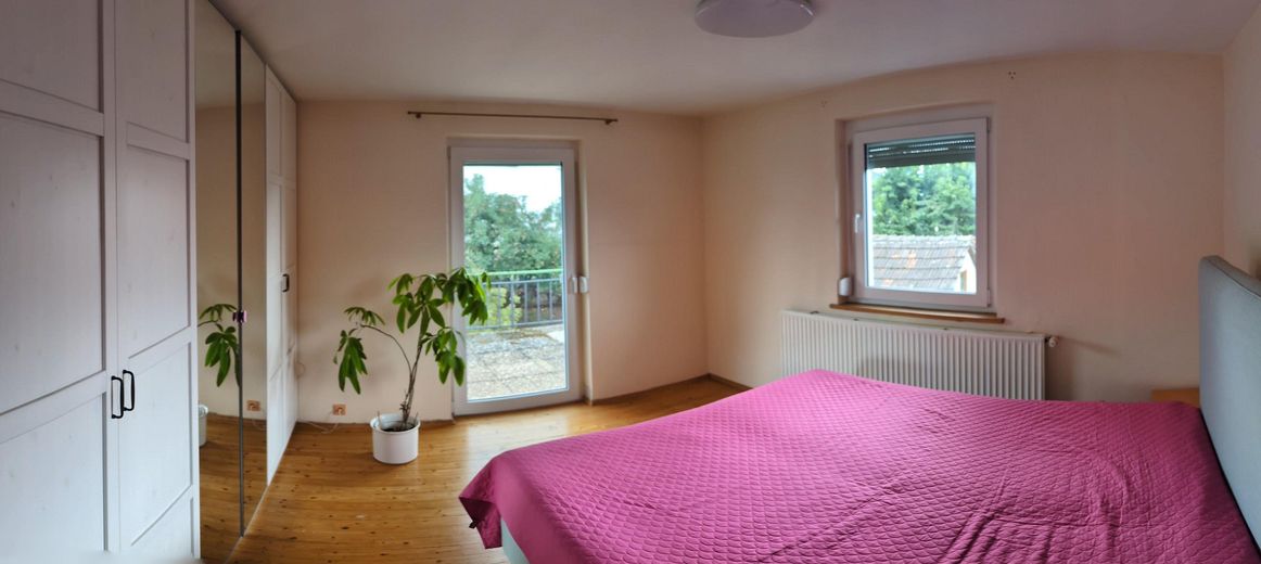 Das OG besteht aus 5 Räumen. Einem kleineren Bad mit Dusche mit Fenster und einem weiteren WC mit Fenster. Vom großen Schlafzimmer gelangt man auf den großen mit einer Markise ausgestatteten Balkon über dem Anbau.