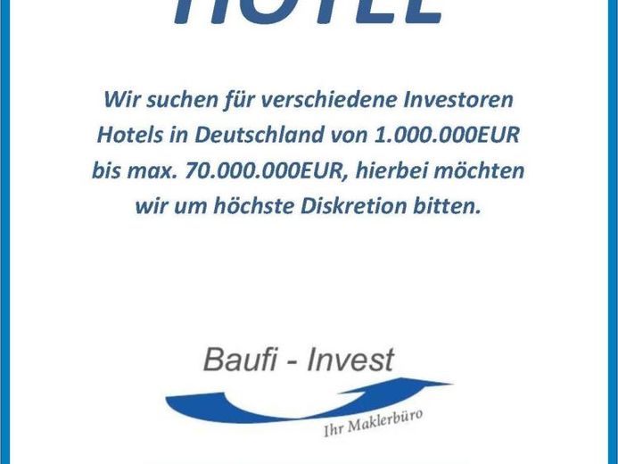 Wir suchen für unsere Investoren und Hoteleigentümer in Deutschland 3 - 5 Sterne Hotels in der Preiskategorie 3 bis 50 Mio.Eine hohe Diskretion ist von uns gewünscht.