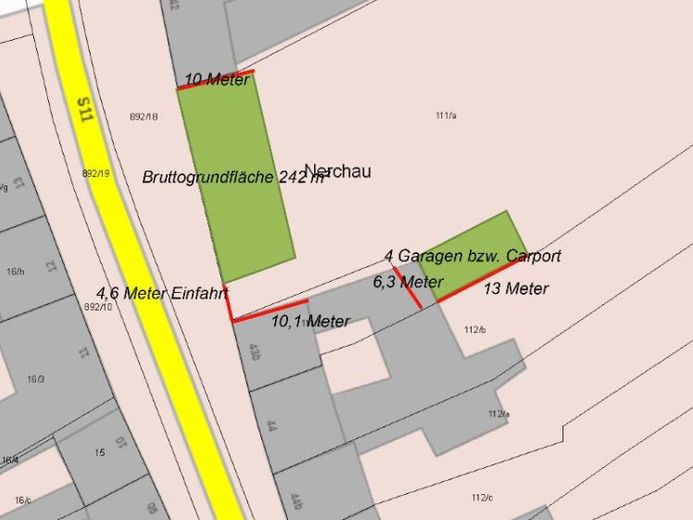 Nach Rücksprache mit dem Landratsamt Borna ist eine Lückenbebauung auf 2 Etagen + Dachgeschoss mit einer Bautiefe von ca.11 m vorgeschrieben um die Nachbarbebauung fortzusetzen. Im hinteren Teil sind Garagen, Carports und diverse Nebengebäude zulässig aber keine Wohnbebauung. Die zu bebauende Grundfläche (brutto) beträgt max. ca.242 m² im Bereich der Straßenfront. An der Grenze zum rechten Nachbarn steht noch ein alter Torpfeiler, welcher noch vom ursprünglichen Hof stammt. In der Regel waren die Zufahrten meist 3,50 m breit zzgl. eines Fußgängerdurchgangs von ca.1,20 m.